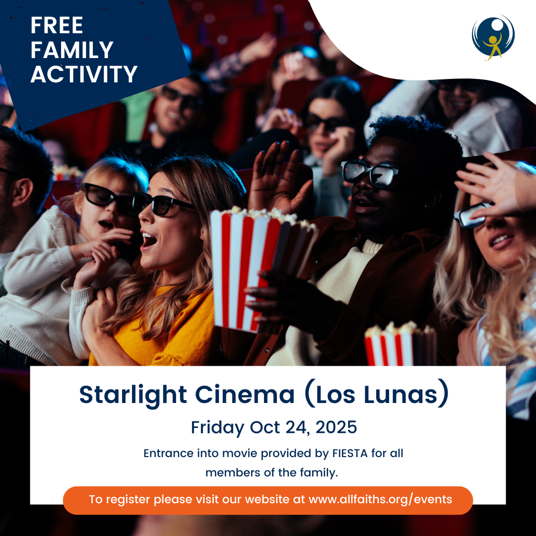 Contact Katie Bustamante at 505-918-0221or kbustamante@allfaiths.org for more information and/or event details. Following online registration, families will receive an email with more information. No cost (free). Free movie tickets for all members of the family. Movie title and exact time of movie start time to be announced when closer to the event date.